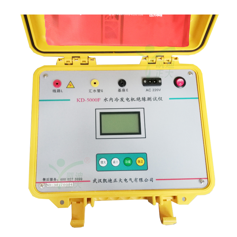 KD5000F水冷發(fā)電機(jī)絕緣電阻測(cè)試儀專用于水內(nèi)冷發(fā)電機(jī)的絕緣測(cè)量試驗(yàn),同時(shí)也可用于試驗(yàn)室或現(xiàn)場(chǎng)做其它材料的絕緣測(cè)試,輸出電流大于40mA。輸出電壓最大5000V,可測(cè)高達(dá)100GΩ的絕緣電阻。內(nèi)含高精度微電流測(cè)量系統(tǒng)、數(shù)字升壓系統(tǒng)。只需要用一條高壓線和一條信號(hào)線連接試品即可測(cè)量。測(cè)量自動(dòng)進(jìn)行,結(jié)果由大屏幕液晶顯示,并將結(jié)果進(jìn)行存儲(chǔ)。不需對(duì)水極化電勢(shì)進(jìn)行補(bǔ)償調(diào)節(jié),機(jī)座與匯水管間的電阻小至3kΩ,也可保證測(cè)量準(zhǔn)確度,水阻大于80kΩ時(shí),可保證測(cè)試準(zhǔn)確度。并自動(dòng)計(jì)算吸收比(R60S/R15S)和極化指數(shù)(R10min/R1min),自動(dòng)儲(chǔ)存15秒、1分鐘、10分鐘的絕緣電阻值。也可用于變壓器等其他電力設(shè)備的絕緣電阻測(cè)試。