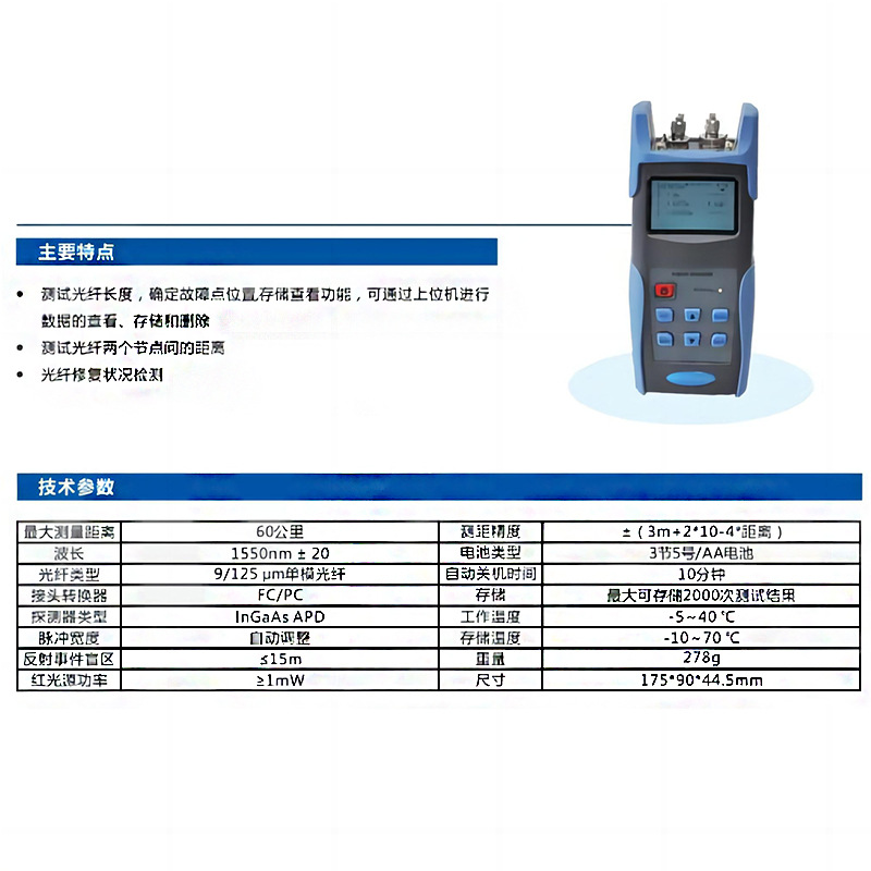 ①:最大探測距離60km是指,在動態范圍內60km處可探測到>1dB的反射事件;非反射事件的探測距離為40km(>1dB)。