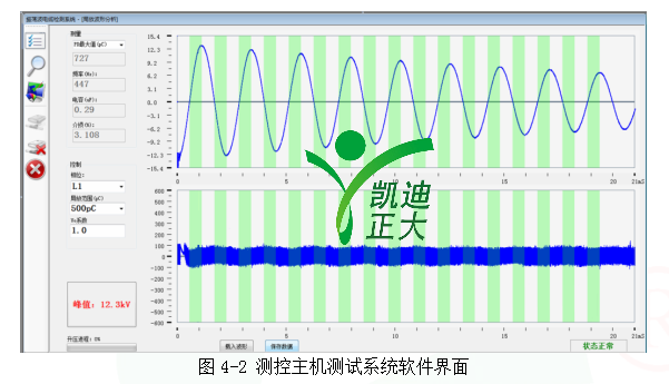 測(cè)控主機(jī)協(xié)調(diào)整個(gè)系統(tǒng)的運(yùn)行,通過無線網(wǎng)絡(luò)控制高壓恒流源升壓蓄能,控制高壓固態(tài)開關(guān)閉合并采集、存儲(chǔ)和分析分壓器/耦合器采集的局放振蕩波信號(hào)和局放信號(hào)。測(cè)控主機(jī)運(yùn)行的測(cè)試系統(tǒng)軟件界面如圖4-2。